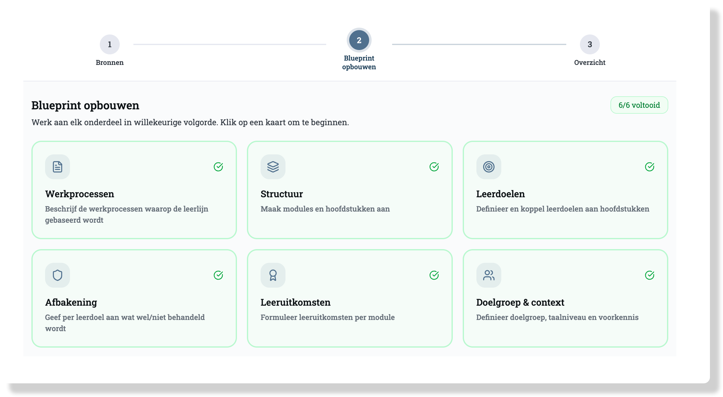 Vergeet het ontwikkelen van losse modules. Door vanuit een blauwdruk te werken, kun je gemakkelijk een heel leertraject uitdenken. Ontwikkelen op grote schaal is nog nooit zo overzichtelijk geweest. Met AI-ondersteuning bewaak je de samenhang, zorg je dat alle leerdoelen helder en gedekt zijn en breng je structuur aan. Met deze stevige inhoudelijke basis ben je klaar om aan de slag te gaan.