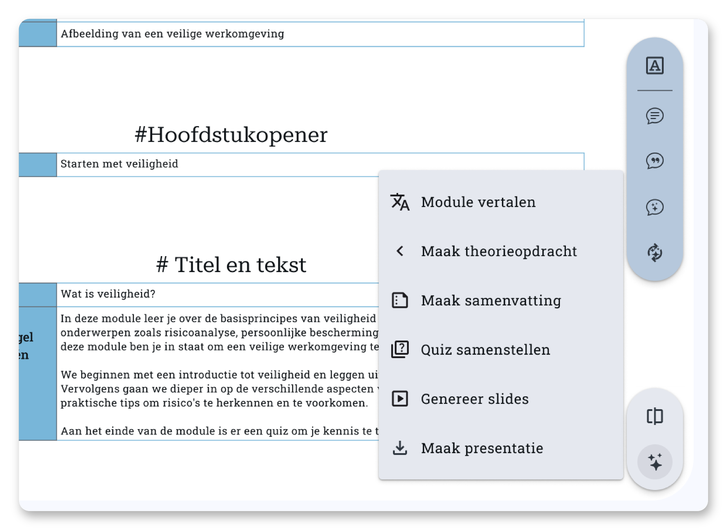 Onze AI is getraind op basis van onderwijskundig materiaal en didactische principes. Geen oppervlakkige trucjes dus. Er wordt niets gegenereerd zonder input op te halen bij jou. Ook na generatie ben jij weer aan zet om tot het beste resultaat te komen. Of je nu AI wil gebruiken of zelf inhoud wil toevoegen: alles is mogelijk.